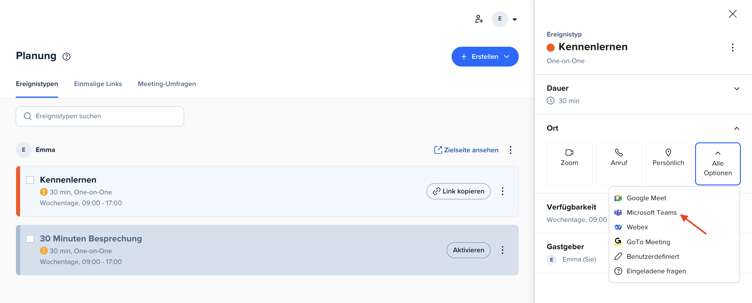 Nach erfolgreicher Verbindung solltest du einen Testtermin buchen, um die Funktionalität zu überprüfen. Erstelle einen neuen Event-Typ oder bearbeite einen bestehenden und wähle Microsoft Teams als Videokonferenz-Option.