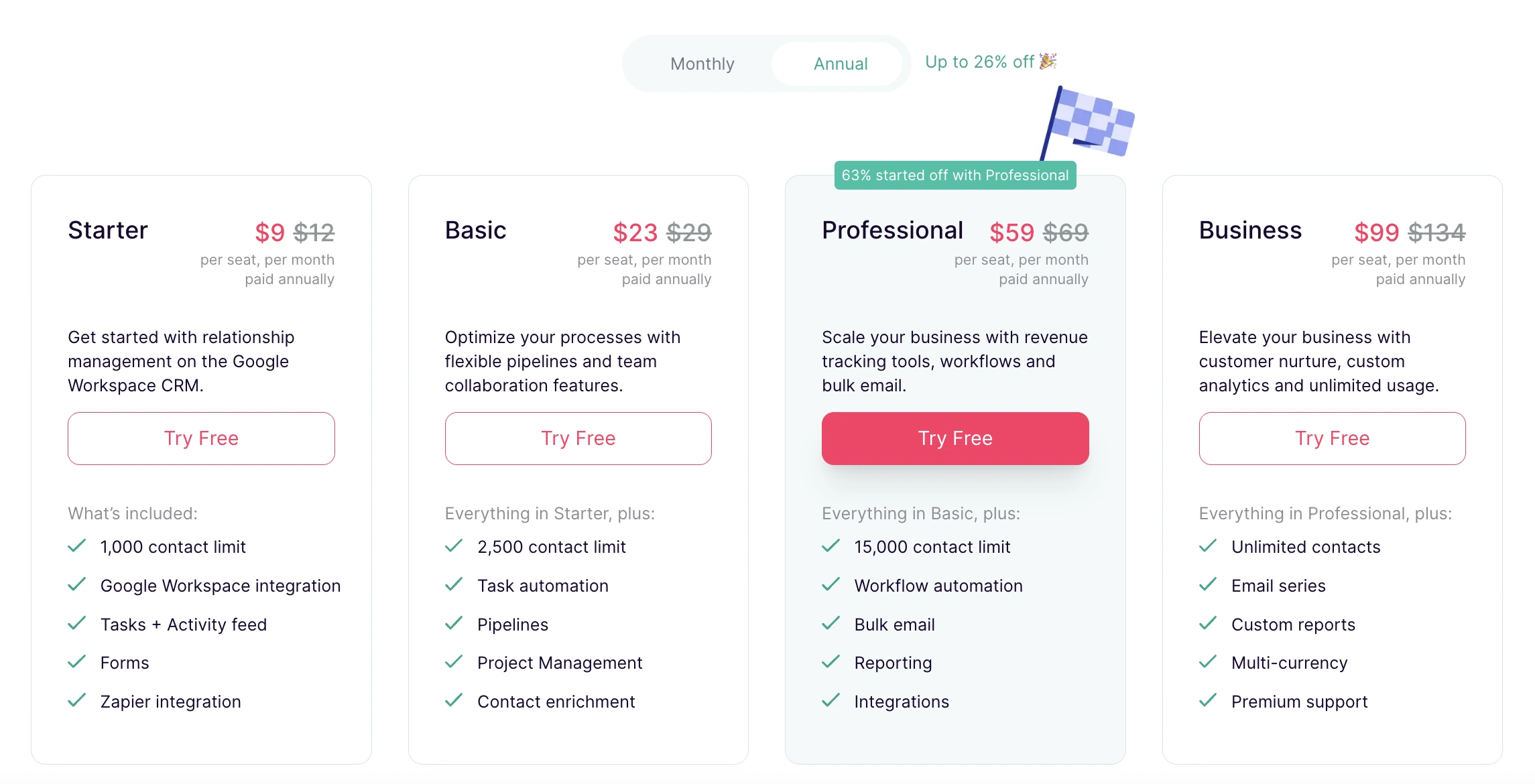 Die Copper CRM Preisstruktur basiert auf vier Tarifen mit jährlicher Abrechnung, die etwa 26% günstiger ist als monatliche Zahlung: