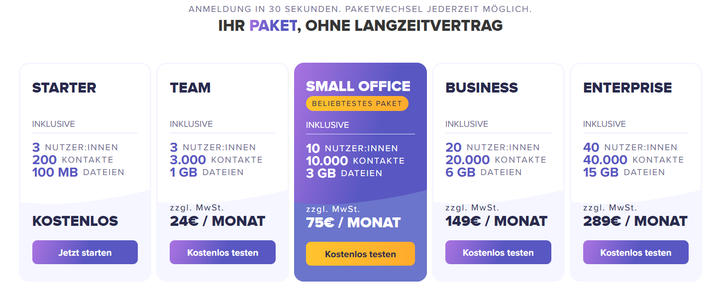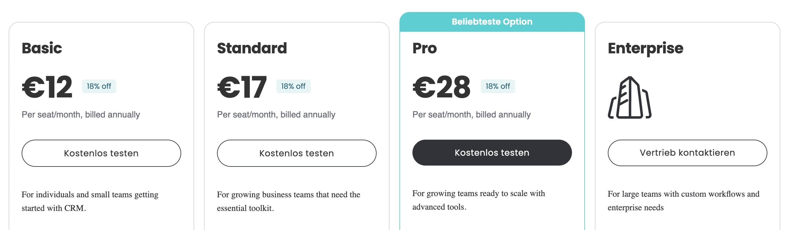 - Business (16€/Nutzer/Monat): Team-Management, Pipeline-Tracking, Round-Robin-Verteilung