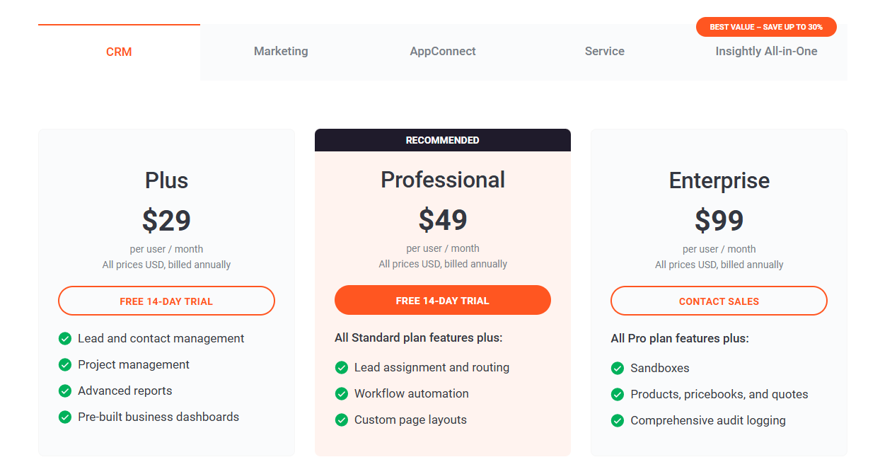 Insightly bietet drei Tarifstufen bei jährlicher Abrechnung: Der Plus-Plan startet bei 29$ pro Nutzer/Monat mit CRM-Funktionen. Der Professional-Plan kostet 49$ und enthält zusätzliche Automatisierungen. Der Enterprise-Plan liegt bei 99$ und bietet erweiterte Funktionen wie Sandboxes und detailliertes Audit-Logging.