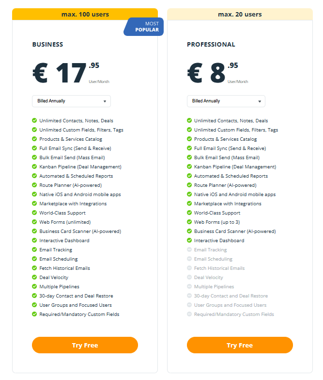 OnePageCRM bietet zwei Tarife mit jährlicher oder monatlicher Abrechnung: Der Professional-Plan kostet 8,95€ pro Nutzer/Monat (bis 20 Nutzer). Der Business-Plan liegt bei 17,95€ pro Nutzer/Monat (bis 100 Nutzer). Beide Tarife beinhalten unbegrenzte Kontakte und einen kostenlosen 21-tägigen Testzeitraum.