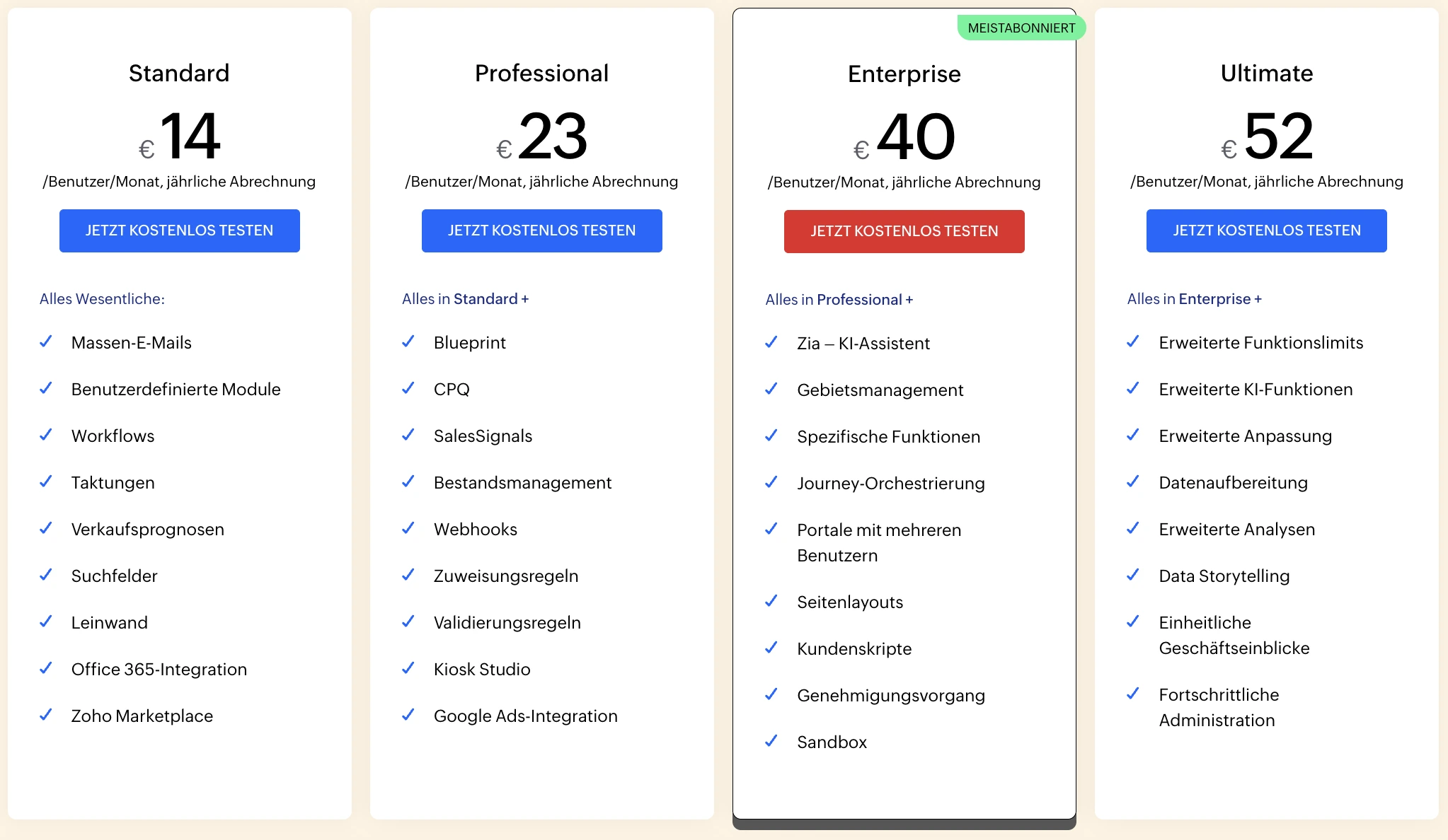 Stand: November 2025. Alle Angaben ohne Gewähr. Aktuelle Preise und detaillierte Informationen findest du auf der Zoho CRM Website.