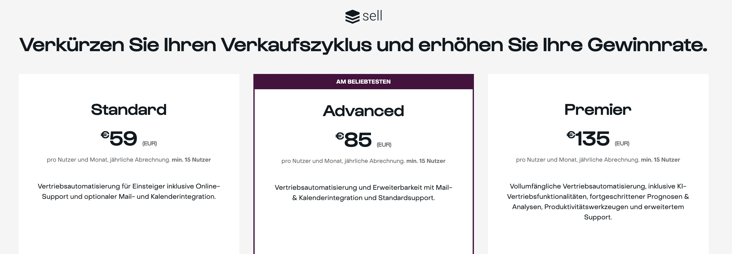 - Die Vertriebslösung Sugar Sell kostet ab 59€ pro Nutzer/Monat (mindestens 15 Nutzer),
