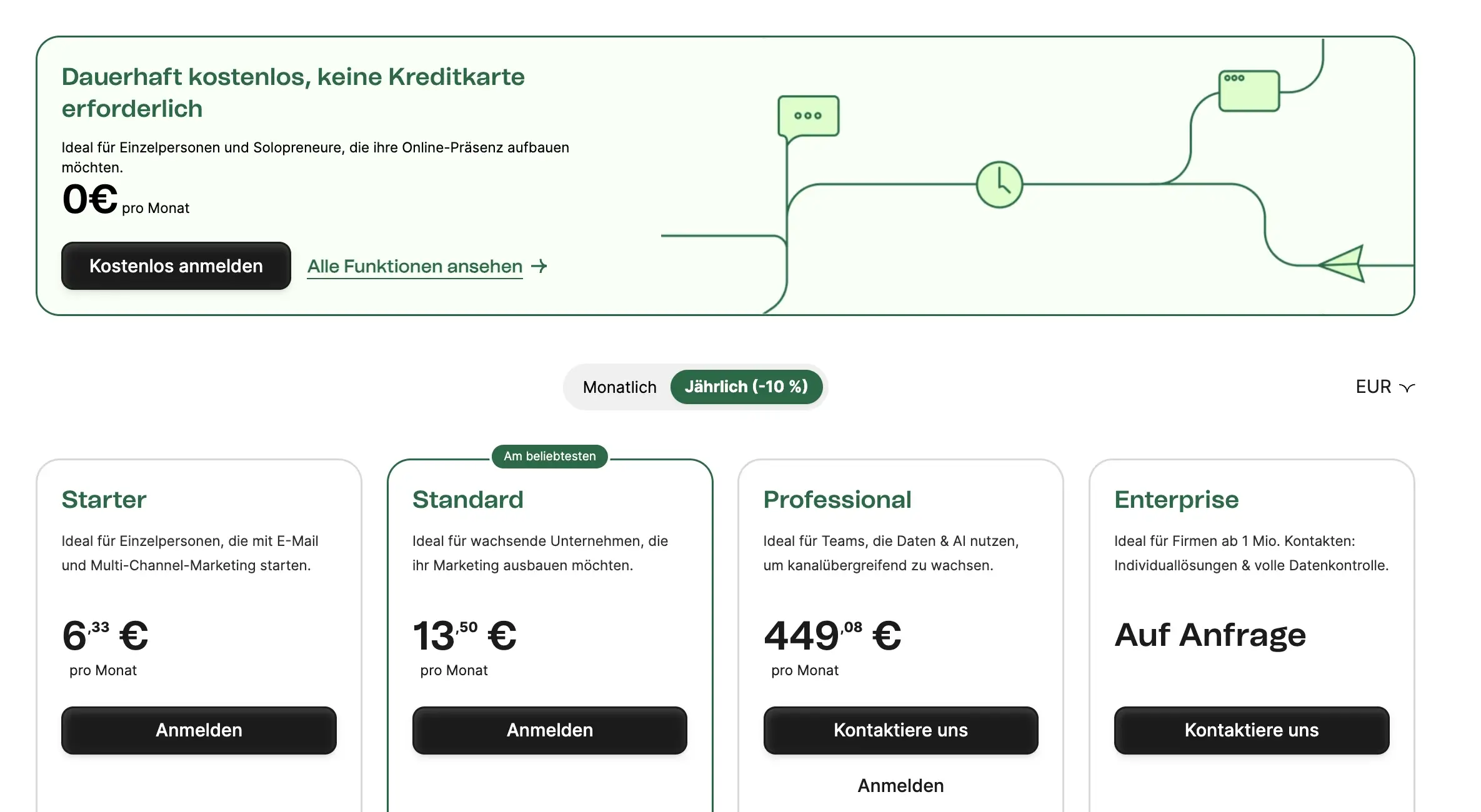 Brevo bietet Tarife für Unternehmen jeder Größe an – vom Starter-Paket ab 6,33 € pro Monat bis hin zum Enterprise-Paket für individuelle Ansprüche (Preis auf Anfrage). Außerdem kannst du viele Funktionen dauerhaft kostenlos nutzen.