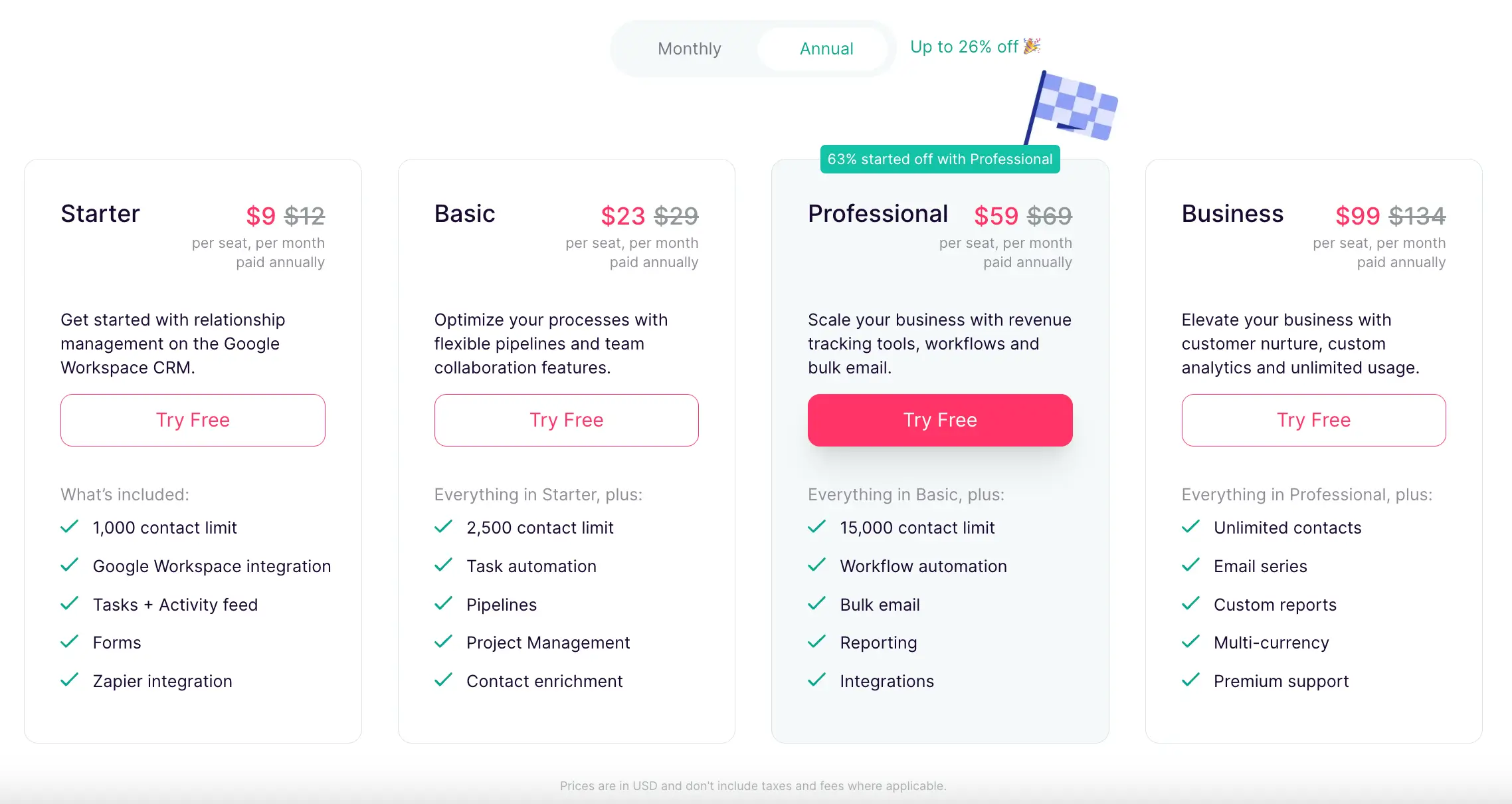 Key features include Google Workspace integration, basic task management, activity tracking, and form creation through Zapier connections. You'll get essential CRM functionality without the complexity that larger teams require. The plan includes mobile apps for iOS and Android, allowing you to manage contacts and tasks while away from your desk.