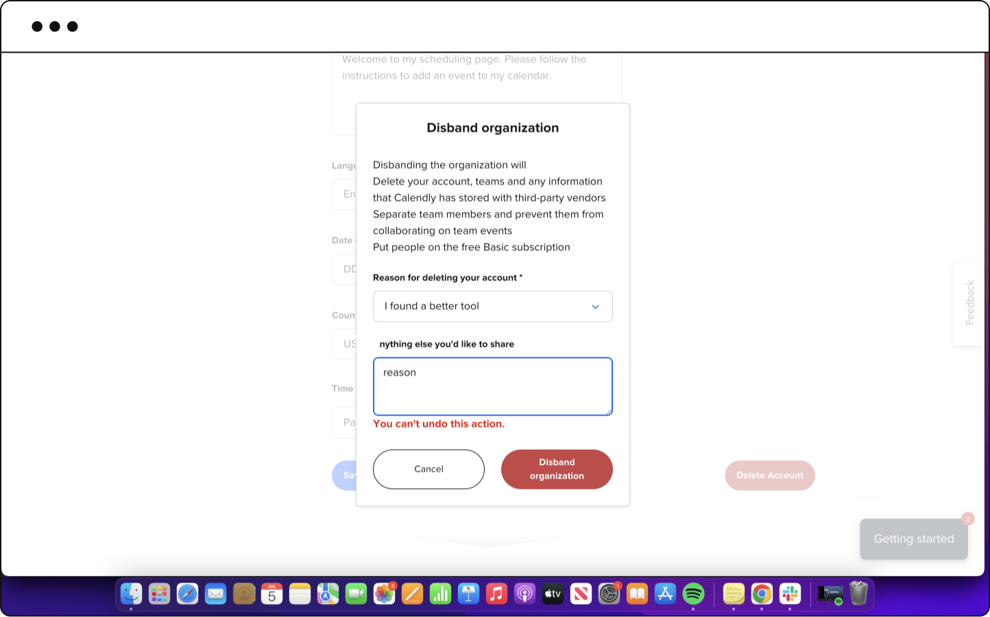 When you delete Calendly account, these actions are permanent. All scheduled meetings get canceled, event types are removed, and team access is revoked. Your integrations disconnect and data gets permanently deleted. Choose this option only when you're certain you won't need any Calendly functionality.