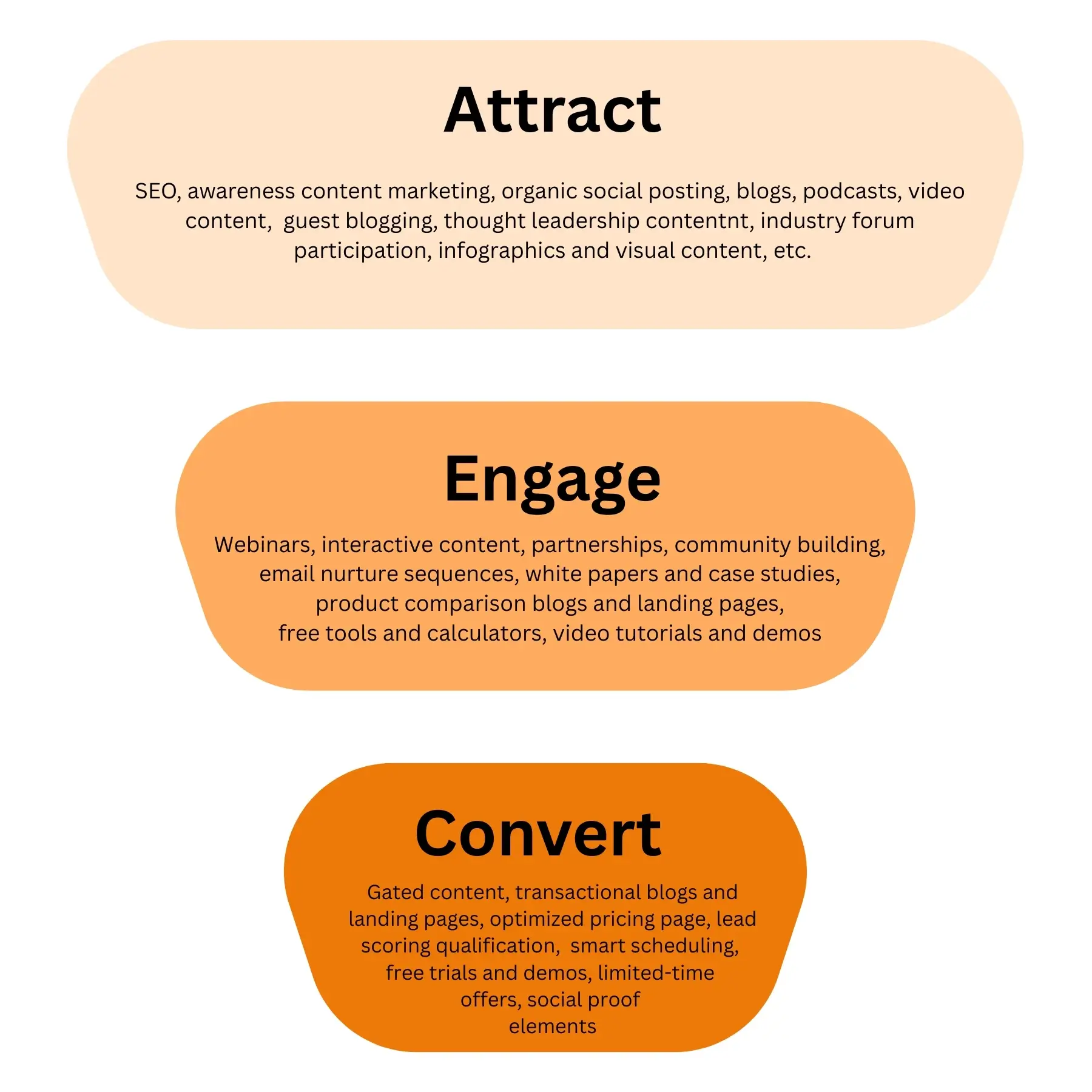 - Create content for each stage of the buyer's journey: Develop awareness content to educate your prospects about their problems; consideration (commercial investigation) content that explores potential solutions, and decision-stage (or transactional) content that helps them choose between options.