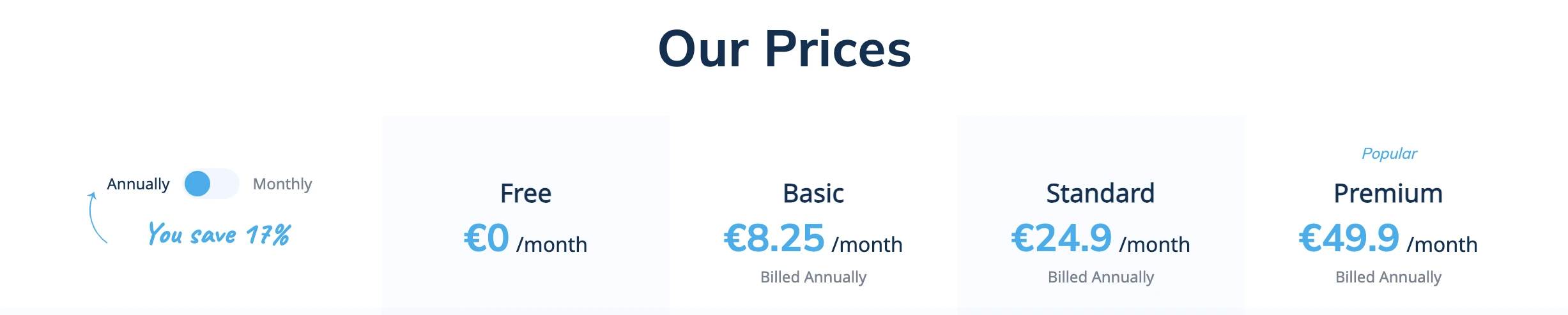 If you want to pay annually, that saves you 17% across the board. That brings Basic down to €8.25 monthly, Standard to €24.90, and Premium to €49.90.