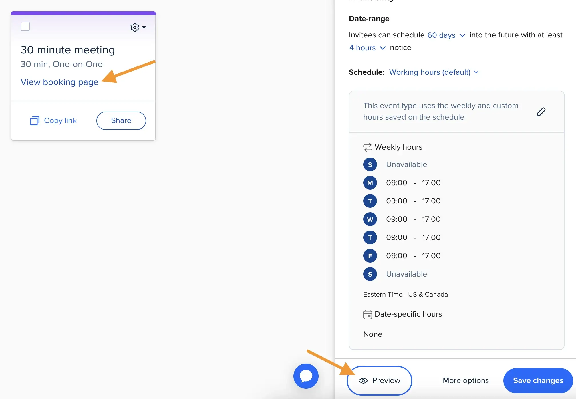 3. Click on "View booking page" from the event type or click directly on the event type and then select "Preview" from the right menu