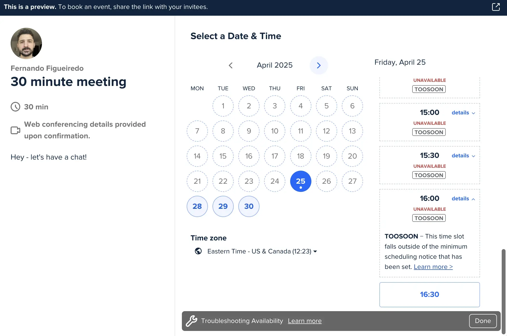 A TOOSOON error means the time slot falls within your minimum scheduling notice period. For example, if you require 24 hours' notice for bookings, slots within that window will show this error and thus you’ll have Calendly showing no times available.